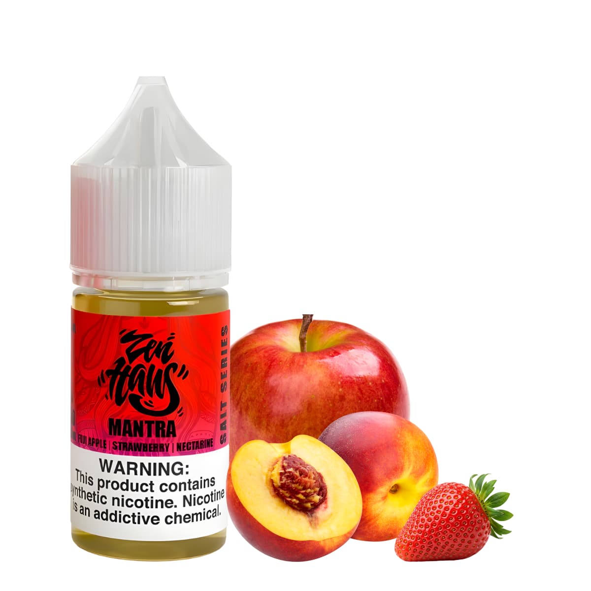 Zen Haus Mantra . Mezcla frutal equilibrada y llena de frescura. La manzana Fuji aporta un sabor crujiente y ligeramente dulce, la fresa añade notas suaves y aromáticas, y la nectarina completa la combinación con su dulzura jugosa y natural. El resultado es un perfil frutal armonioso, fresco y agradable, ideal para quienes buscan un sabor dulce y bien balanceado en cada uso.